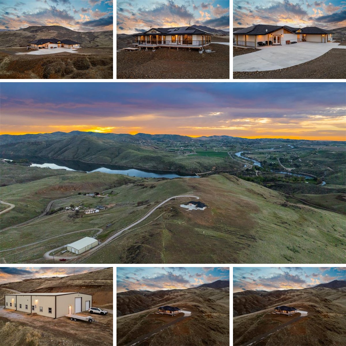 Enjoy the breathtakingly, spectacular 360° views of high mountains, deep, green valleys and waterways, with an unobstructed view to the Payette River & Emmett Valley. Clean, fresh mountain air above the Boise area inversion, warmer in the winter and cooler in the summer than Boise and the Treasure Valley. Each room of this luxurious home presents an equally magnificent, yet uniquely different view. Witness nature’s colors change moment by moment with the passing of a cloud or a season. Experience stunning moon rises and crystal-clear star gazing. Very private, very peaceful, with space to expand your kingdom. This custom-built straw bale home by EarthCraft Design Build offers a perfect blend of eco-friendly materials and cutting-edge green building science. Nestled on 40 acres in the foothills, the home boasts exceptional energy efficiency with locally sourced straw bale insulation, natural plasters, and passive solar design. Thoughtfully sited to enhance comfort year-round, this home is designed to reduce energy use while maximizing natural beauty. With reclaimed wood, non-toxic finishes, and breathability, this property connects you to nature in a way few homes can. A true example of resilience, sustainability, and long-term savings. The 85x60 Shop offers a 2 bed, 2.5 bath apartment w/ kitchen & living room as well as plenty of extra space for your RV, toys & more! A true Idaho gem awaits you!